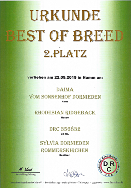 20. September 2019. Bisher hatte ich mich als Züchterin nicht an Ausstellungen beteiligt. Um so gespannter waren wir auf unser Abschneiden bei der vom Deutschen Rassehunde Club e.V. ausgerichteten "Sonderschau Rhodesian Ridgeback" in Hamm.