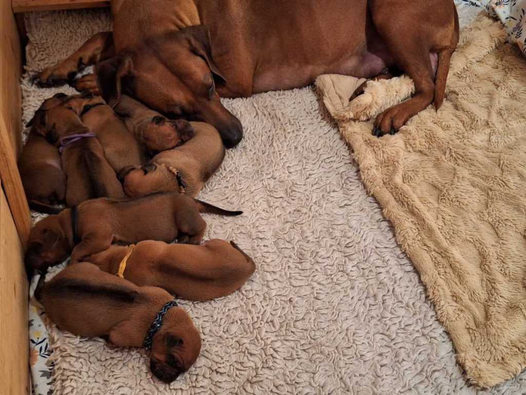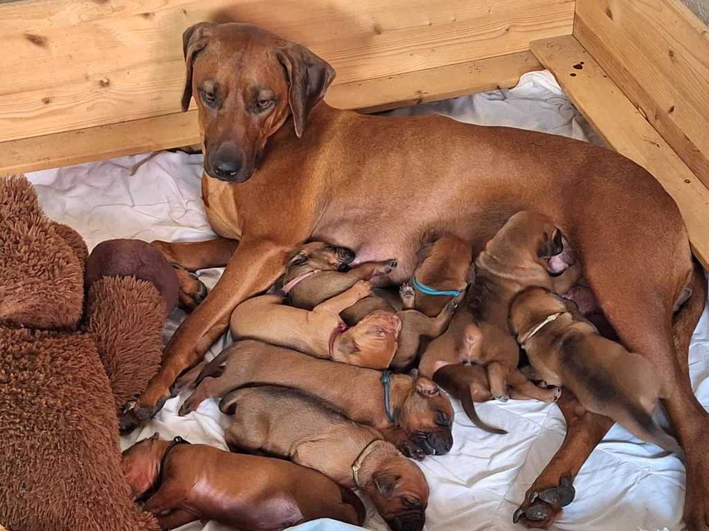 28. Mai 2024. Etwas früher als erwartet haben wir heute Nachwuchs bekommen. Unsere Hündin Shadow ist zum ersten Mal Mama geworden und hat neun gesunde Welpen zur Welt gebracht. Wir sind überglücklich und stolz auf unsere Shadow. Sie hat die aufregenden Stunden mit Bravour gemeistert.